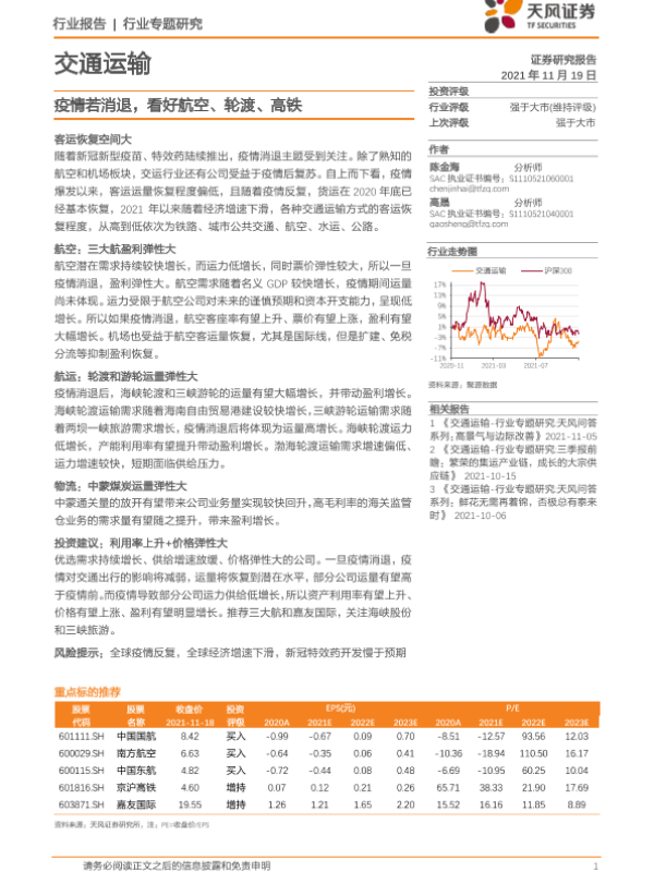 【天风证券】【20211119】交通运输行业专题研究:疫情若消退,看好航空、轮渡、高铁-15页