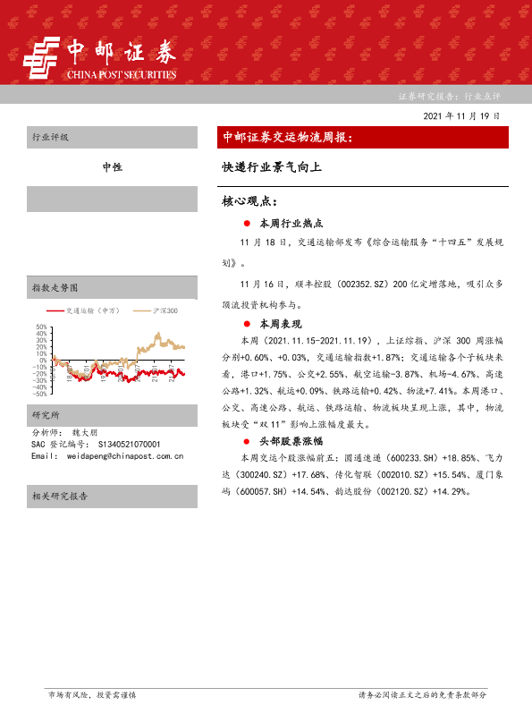 【中邮证券】【20211119】交运物流周报:快递行业景气向上-14页