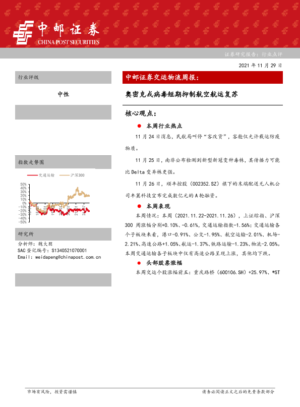 【中邮证券】【20211129】交运物流周报:奥密克戎病毒短期抑制航空航运复苏-14页