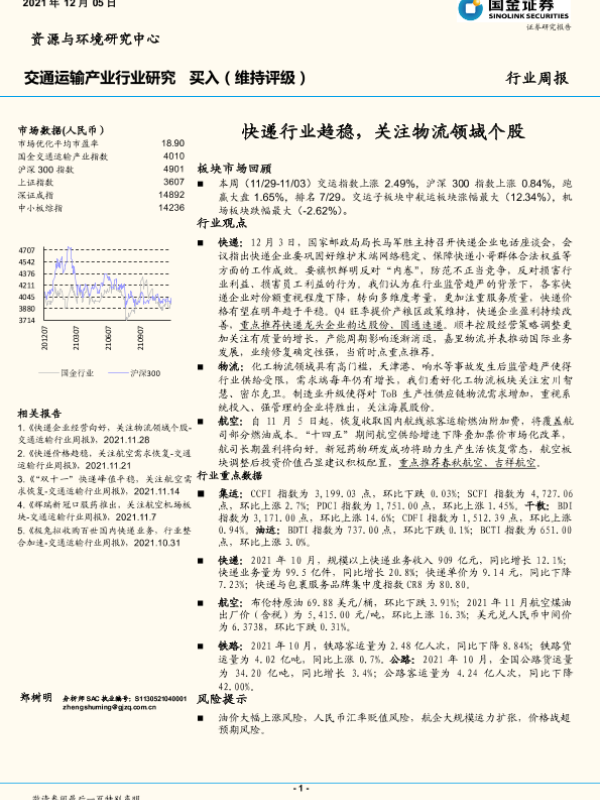 【国金证券】【20211205】交通运输行业周报:快递行业趋稳,关注物流领域个股-14页