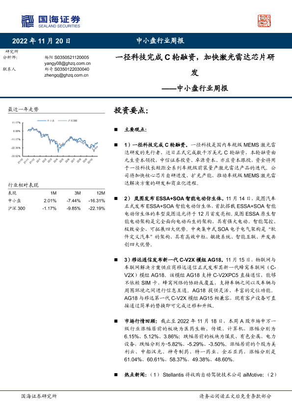 【国海证券】【20221120】中小盘行业周报:一径科技完成C轮融资,加快激光雷达芯片研发-18页