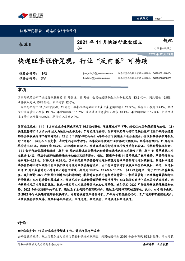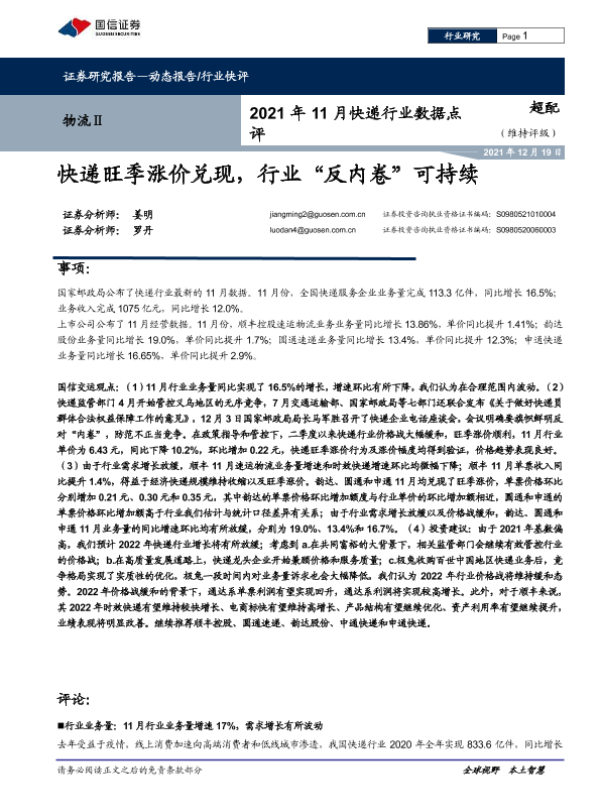 【国信证券】【20211219】2021年11月快递行业数据点评:快递旺季涨价兑现,行业“反内卷”可持续-7页