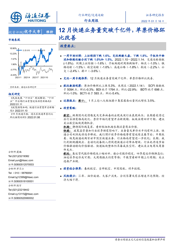 【海通证券】【20220116】12月快递业务量突破千亿件,单票价格环比改善-9页