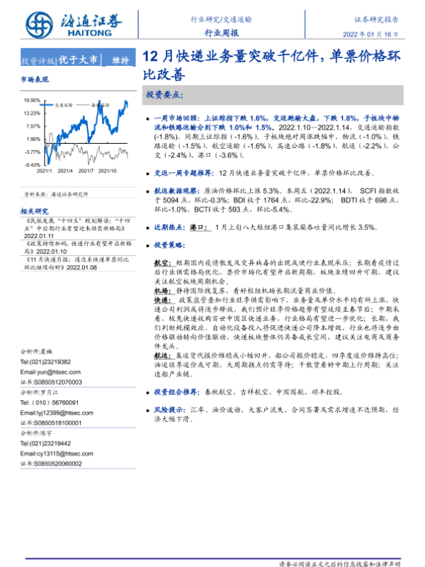 交通运输 单票价格 市场表现 快递业务 行业周报