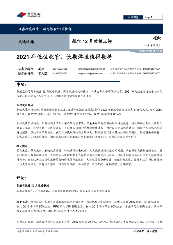 【国信证券】【20220117】交通运输航空12月数据点评:2021年低位收官,长期弹性值得期待-8页