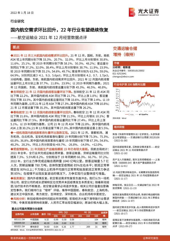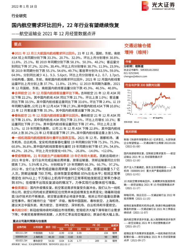【光大证券】【20220118】航空运输业2021年12月经营数据点评:国内航空需求环比回升,22年行业有望继续恢复-8页