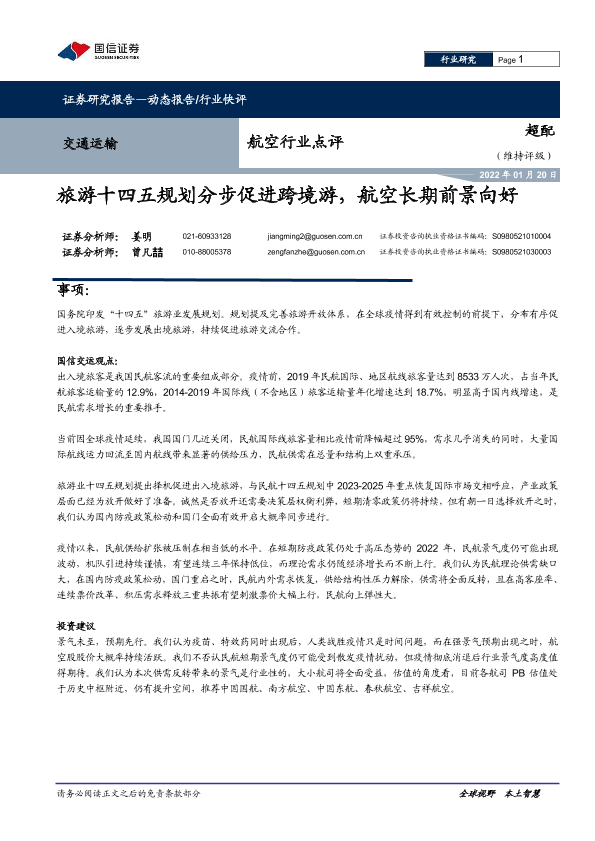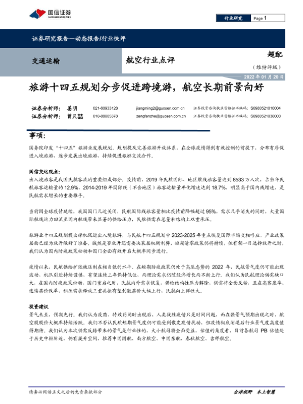 【国信证券】【20220120】航空行业点评:旅游十四五规划分步促进跨境游,航空长期前景向好-5页