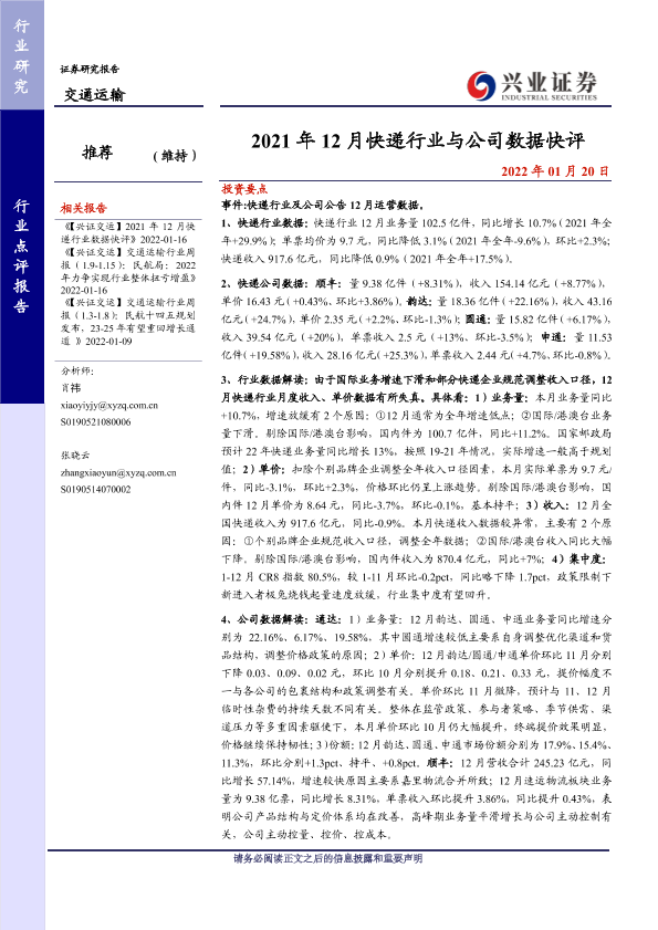 【兴业证券】【20220120】2021年12月快递行业与公司数据快评-17页