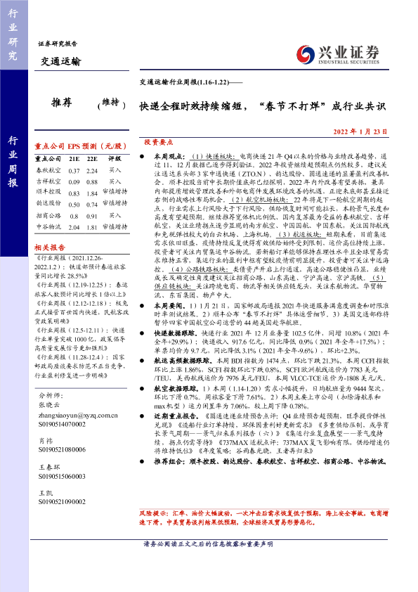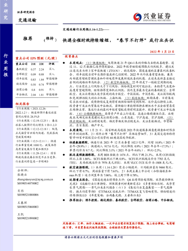 【兴业证券】【20220123】交通运输行业周报:快递全程时效持续缩短,“春节不打烊”成行业共识-29页