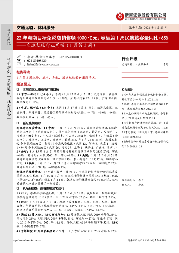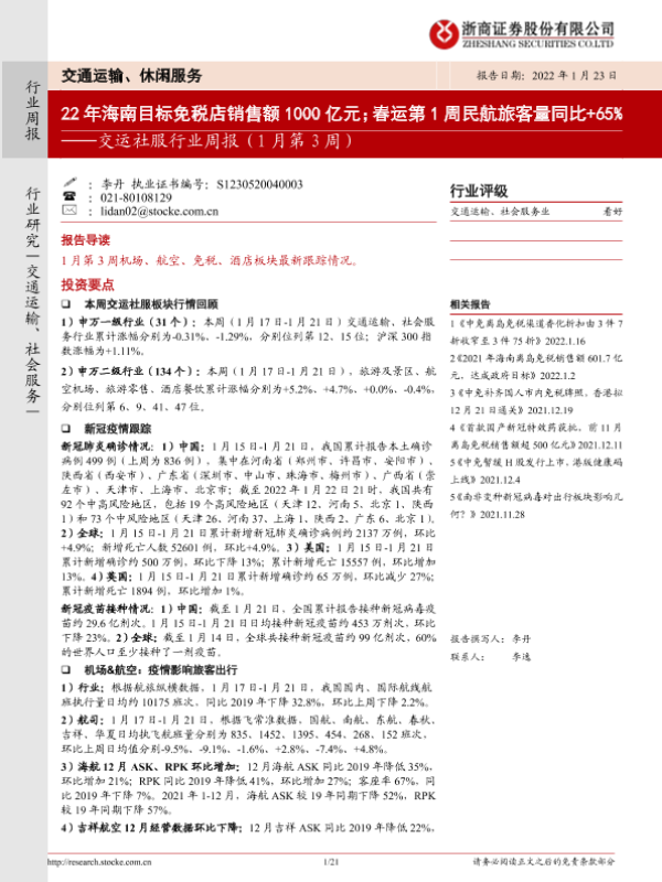 【浙商证券】【20220123】交运社服行业周报:22年海南目标免税店销售额1000亿元;春运第1周民航旅客量同比+65%-21页