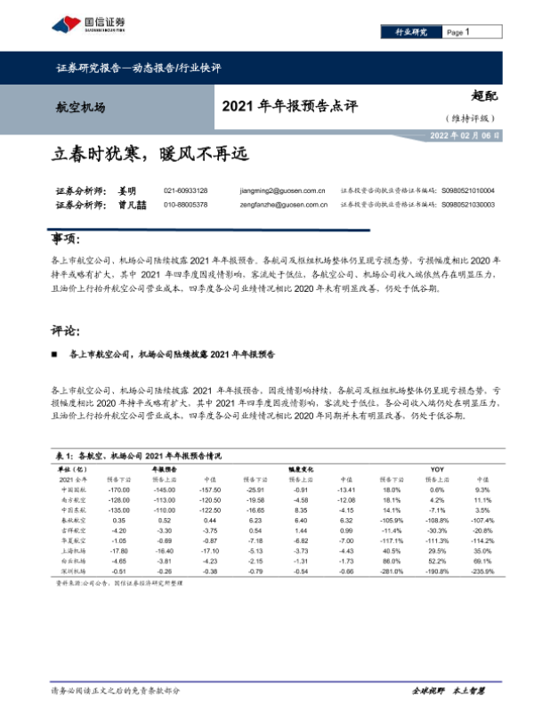 【国信证券】【20220206】航空机场2021年年报预告点评:立春时犹寒,暖风不再远-9页