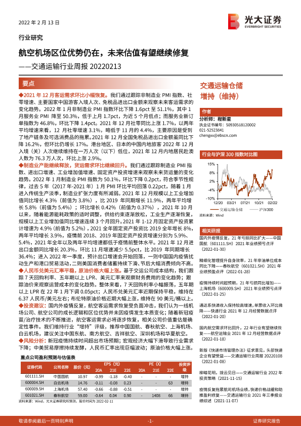 【光大证券】【20220213】交通运输行业周报:航空机场区位优势仍在,未来估值有望继续修复-9页