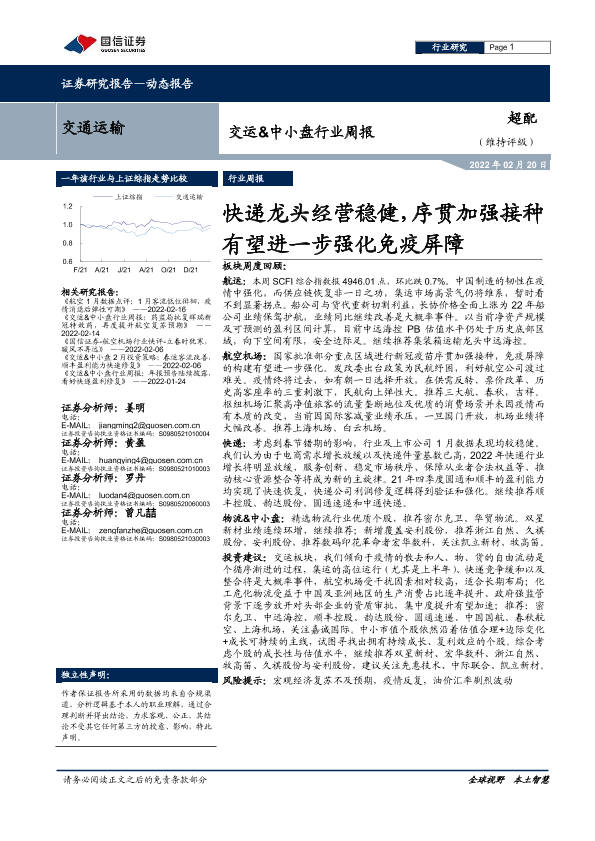 【国信证券】【20220220】交运&中小盘行业周报:快递龙头经营稳健,序贯加强接种有望进一步强化免疫屏障-24页