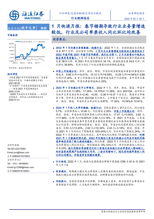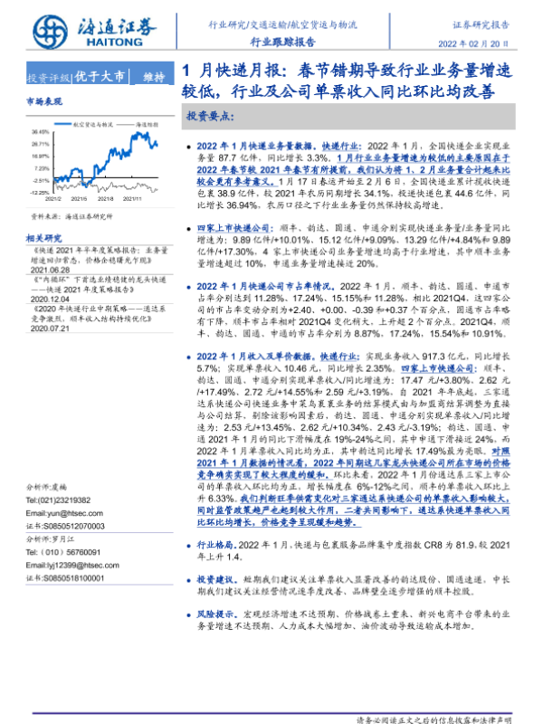 【海通证券】【20220220】1月快递月报:春节错期导致行业业务量增速较低,行业及公司单票收入同比环比均改善-9页