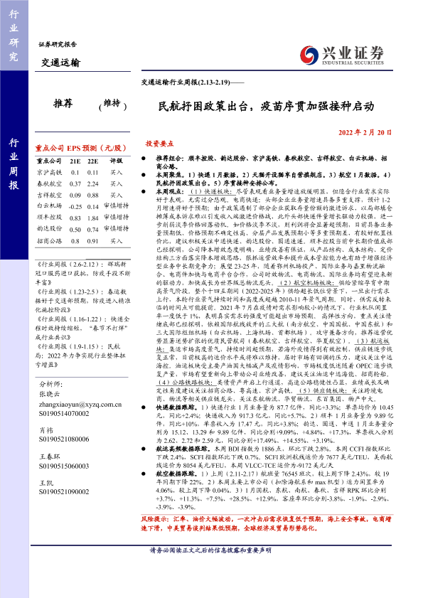 【兴业证券】【20220220】交通运输行业周报:民航抒困政策出台,疫苗序贯加强接种启动-29页