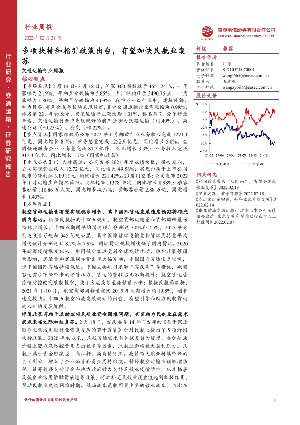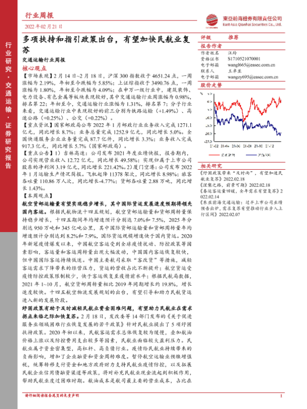 【东亚前海证券】【20220221】交通运输行业周报:多项扶持和指引政策出台,有望加快民航业复苏-20页