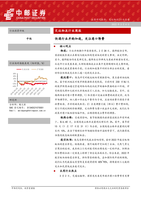 【中邮证券】【20220304】交运物流行业周报:快递行业并购加速,关注港口降费-14页