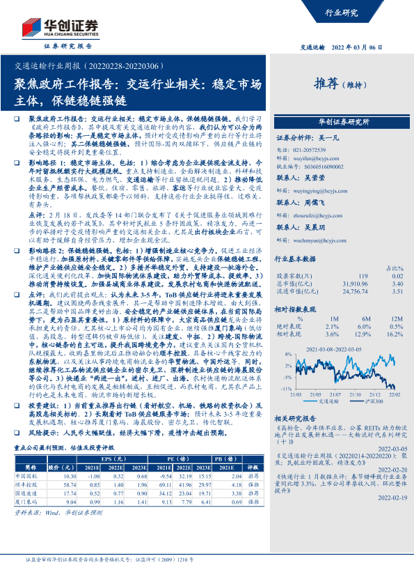 【华创证券】【20220306】交通运输行业周报:聚焦政府工作报告:交运行业相关:稳定市场主体,保链稳链强链-17页