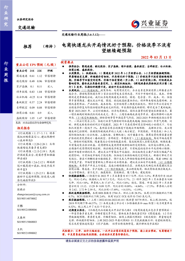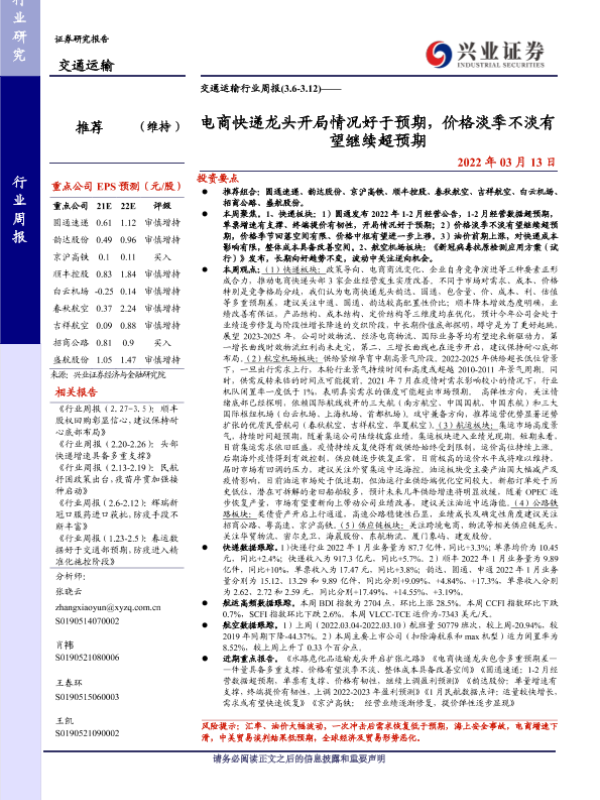 【兴业证券】【20220313】交通运输行业周报:电商快递龙头开局情况好于预期,价格淡季不淡有望继续超预期-28页