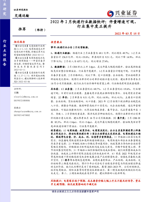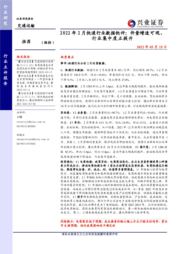 【兴业证券】【20220315】2022年2月快递行业数据快评:件量增速可观,行业集中度正提升-10页