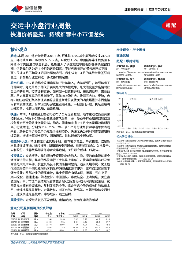 【国信证券】【20220320】交运中小盘行业周报:快递价格坚挺,持续推荐中小市值龙头-27页