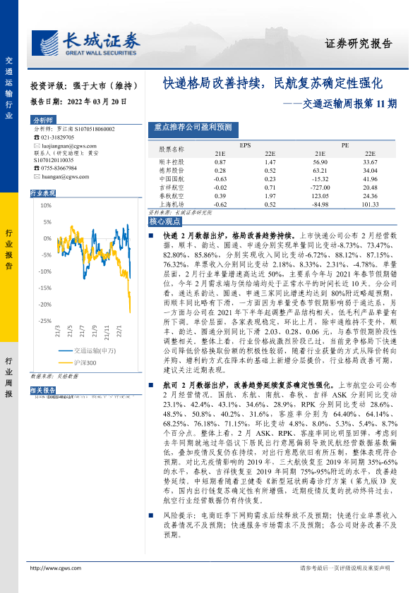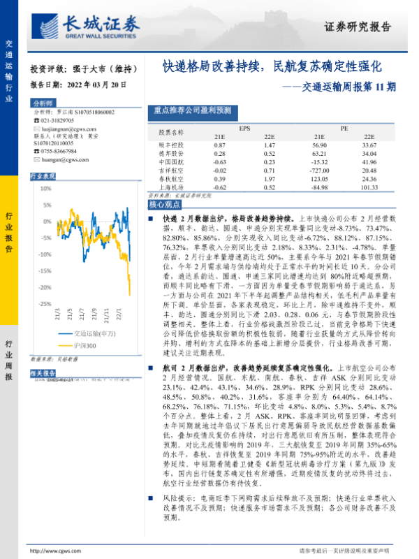 【长城证券】【20220320】快递格局改善持续,民航复苏确定性强化-24页