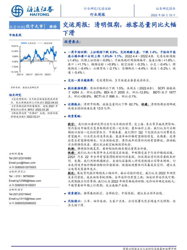 【海通证券】【20220410】交运周报:清明假期,旅客总量同比大幅下滑-9页