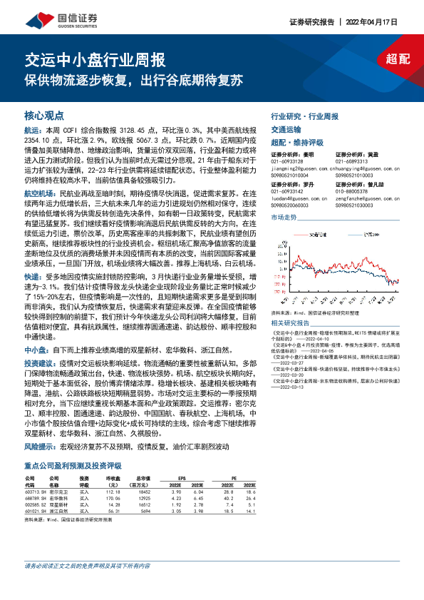 【国信证券】【20220417】交运中小盘行业周报:保供物流逐步恢复,出行谷底期待复苏-28页
