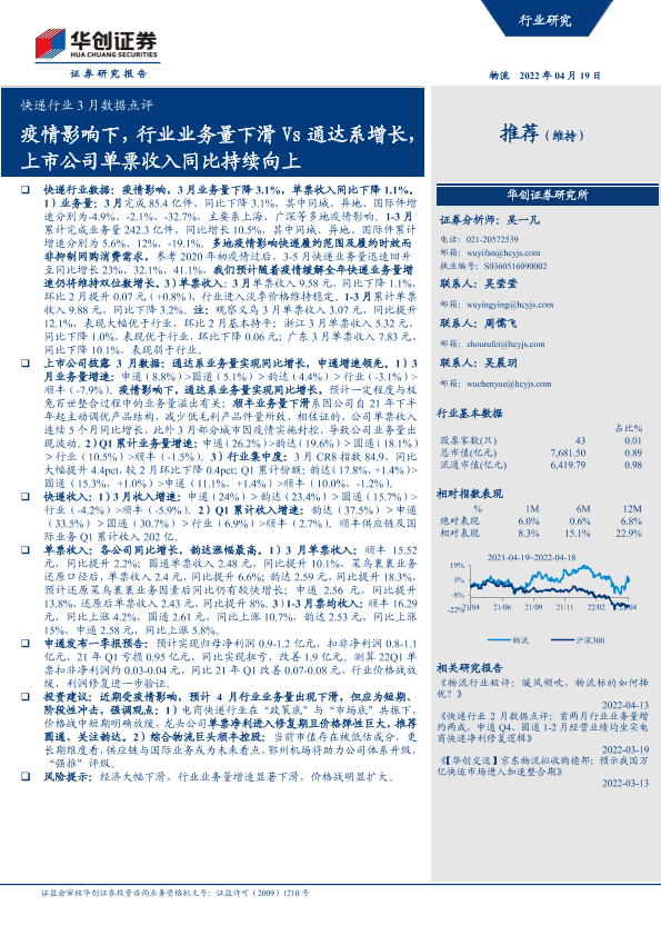【华创证券】【20220419】快递行业3月数据点评:疫情影响下,行业业务量下滑Vs通达系增长,上市公司单票收入同比持续向上-9页
