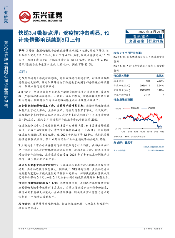 【东兴证券】【20220421】快递3月数据点评:受疫情冲击明显,预计疫情影响延续到5月上旬-9页