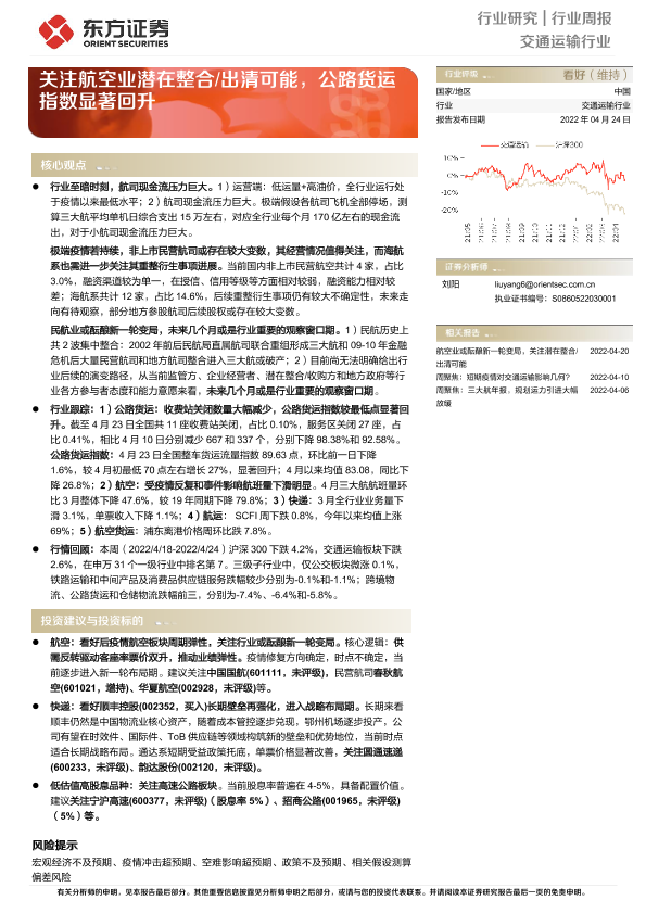 【东方证券】【20220424】交通运输行业周报:关注航空业潜在整合出清可能,公路货运指数显著回升-20页