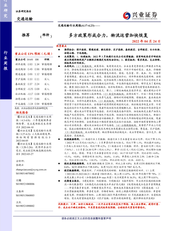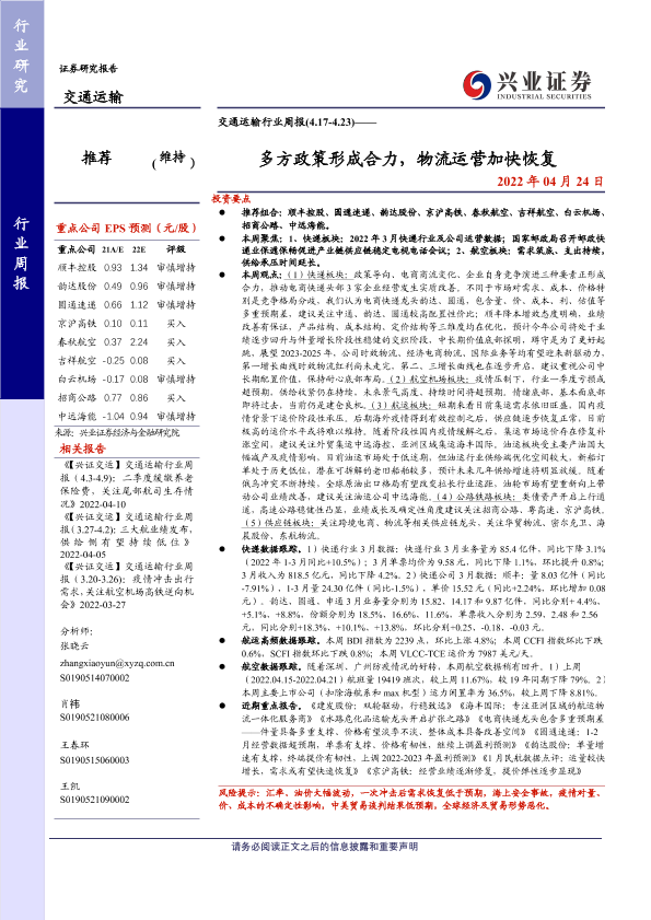 【兴业证券】【20220424】交通运输行业周报:多方政策形成合力,物流运营加快恢复-32页