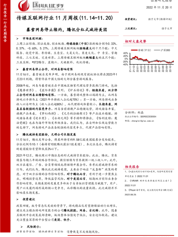 【国联证券】【20221120】传媒互联网行业11月周报:暴雪网易停止续约,腾讯分红式减持美团-16页