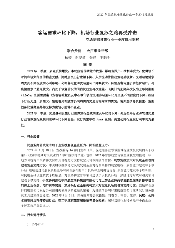 【联合资信】【20220507】交通基础设施行业一季度信用观察:客运需求环比下降,机场行业复苏之路再受冲击-10页