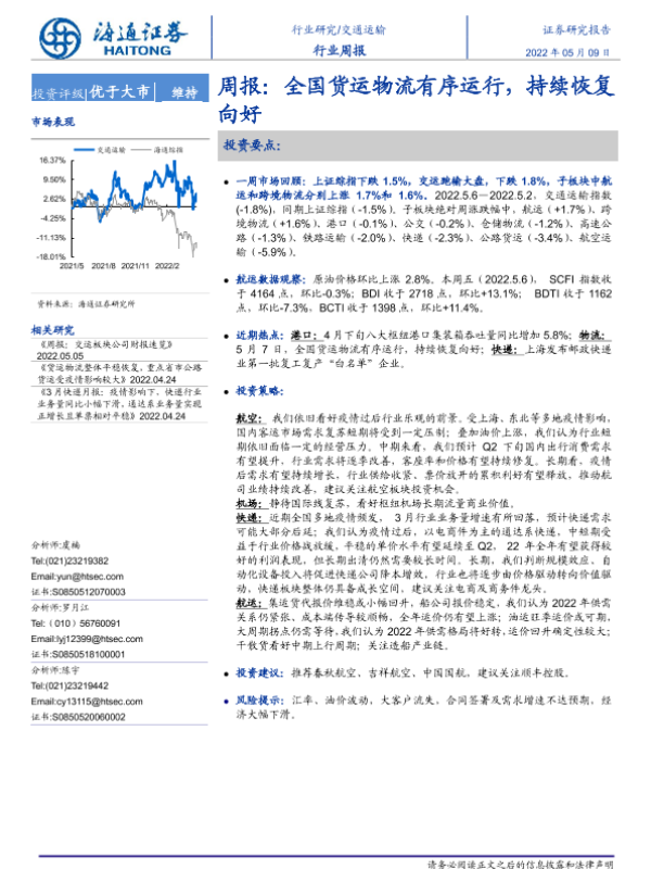 【海通证券】【20220509】全国货运物流有序运行,持续恢复向好-9页
