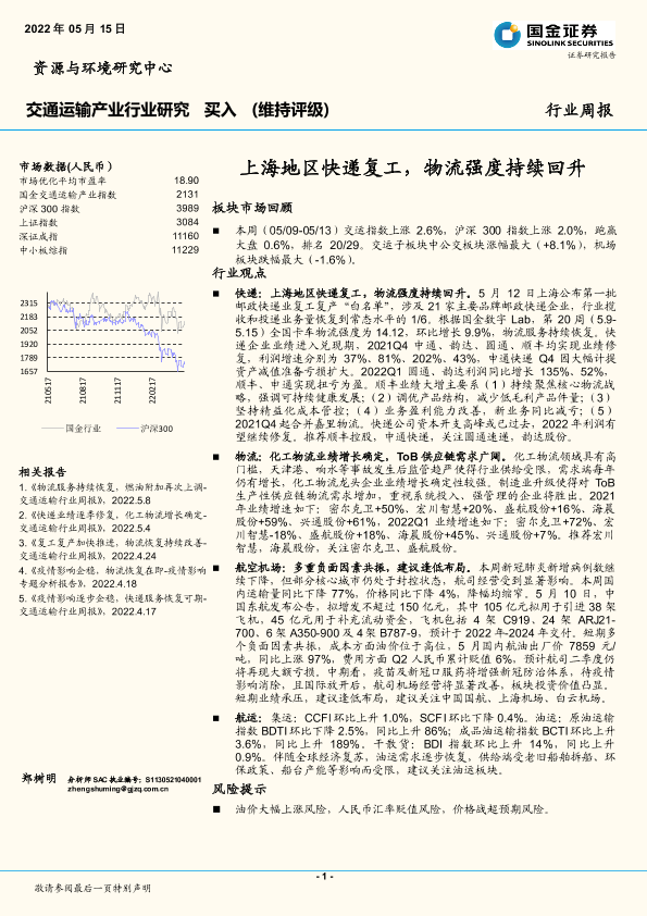 【国金证券】【20220515】上海地区快递复工,物流强度持续回升-15页