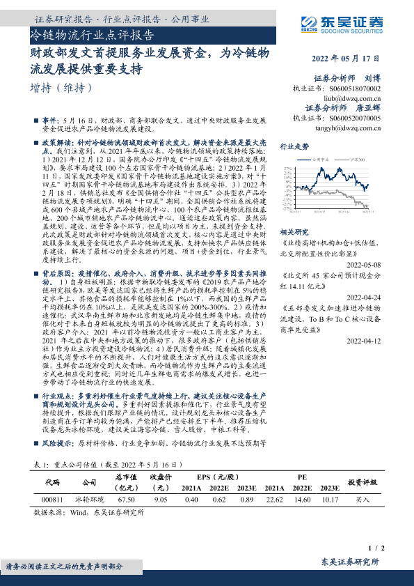 【东吴证券】【20220517】冷链物流行业点评报告:财政部发文首提服务业发展资金,为冷链物流发展提供重要支持-2页