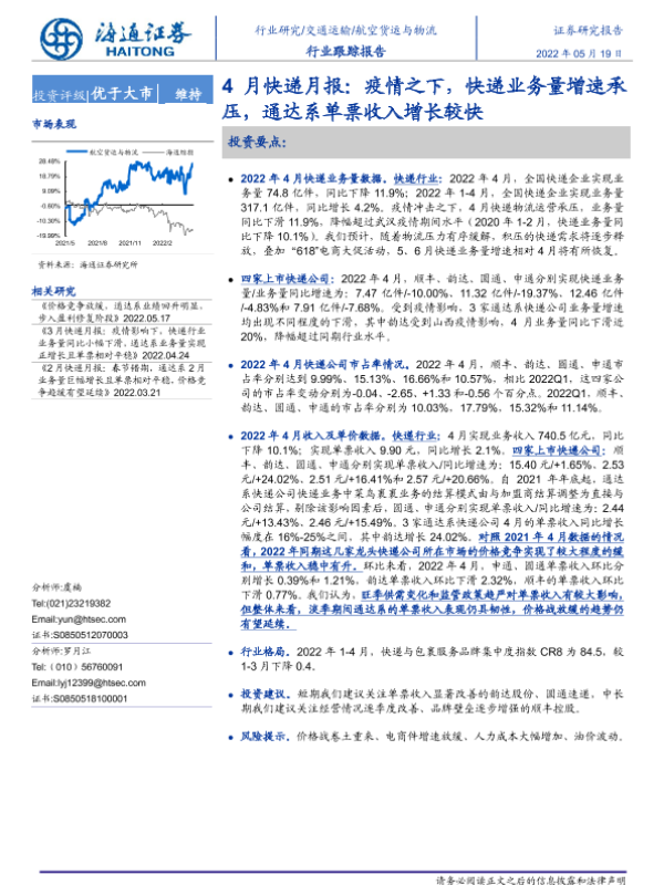 【海通证券】【20220519】4月快递月报:疫情之下,快递业务量增速承压,通达系单票收入增长较快-9页