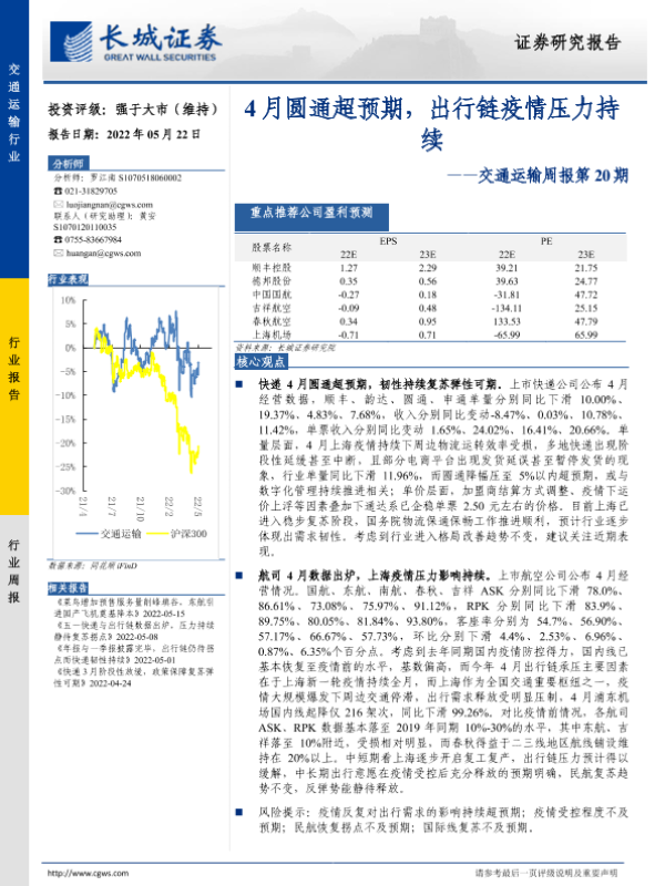 【长城证券】【20220522】4月圆通超预期,出行链疫情压力持续-25页