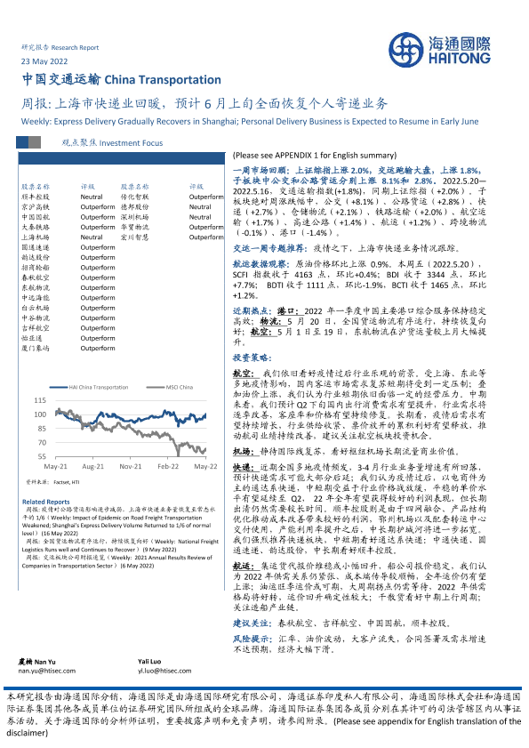 【海通国际】【20220523】中国交通运输周报:上海市快递业回暖,预计6月上旬全面恢复个人寄递业务-14页