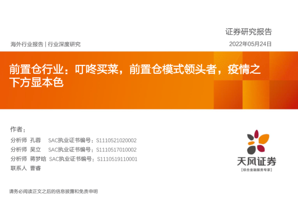 【天风证券】【20220524】前置仓行业:叮咚买菜,前置仓模式领头者,疫情之下方显本色-40页