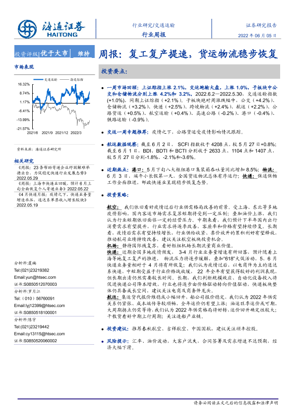 【海通证券】【20220605】交通运输行业周报:复工复产提速,货运物流稳步恢复-11页