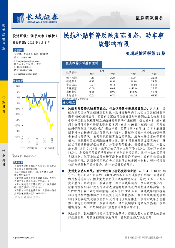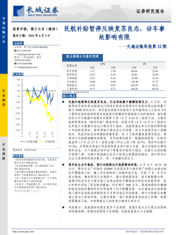 【长城证券】【20220605】交通运输周报第22期:民航补贴暂停反映复苏良态,动车事故影响有限-23页