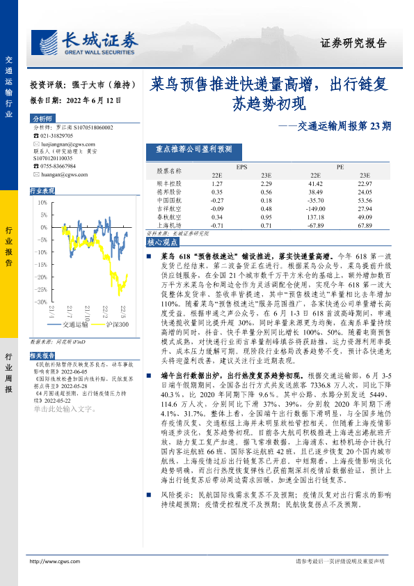 【长城证券】【20220612】交通运输周报第23期:菜鸟预售推进快递量高增,出行链复苏趋势初现-22页