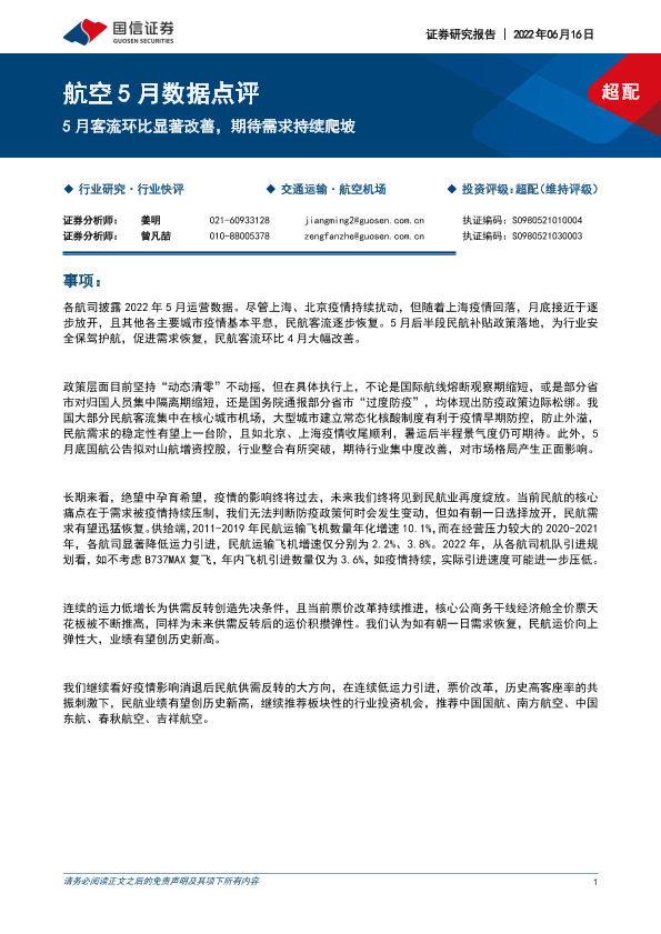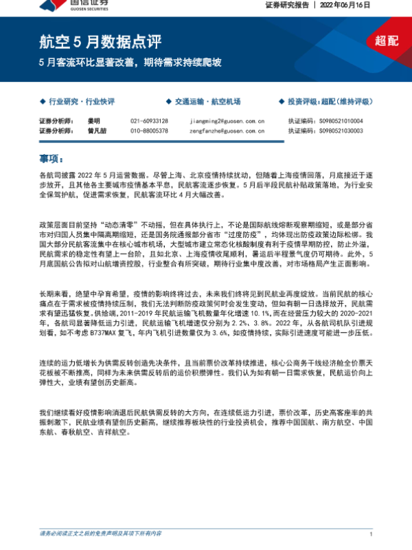 【国信证券】【20220616】航空5月数据点评:5月客流环比显著改善,期待需求持续爬坡-8页