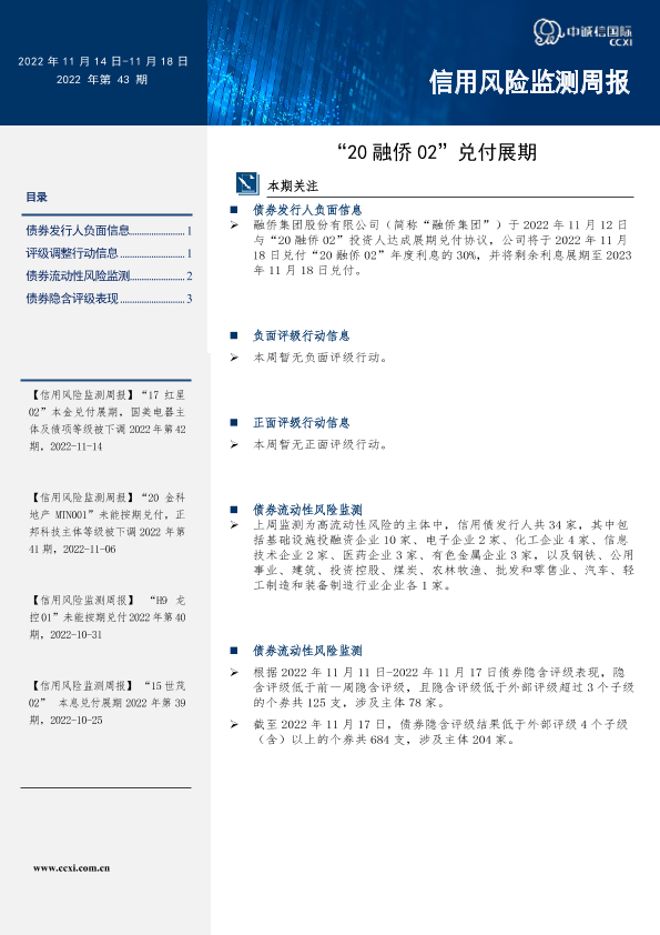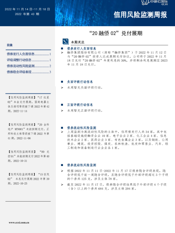 【中诚信国际】【20221118】信用风险监测周报:“20融侨02”兑付展期-17页