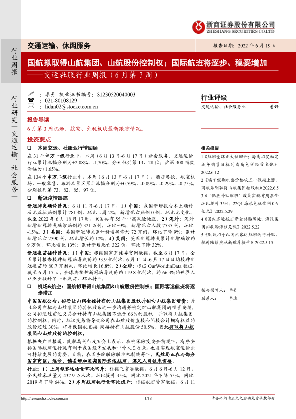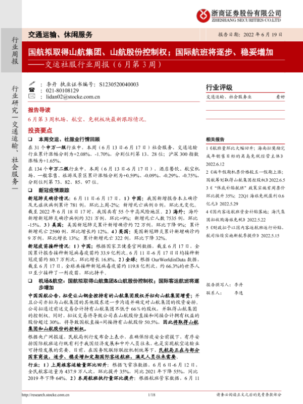 【浙商证券】【20220619】交运社服行业周报:国航拟取得山航集团、山航股份控制权;国际航班将逐步、稳妥增加-18页