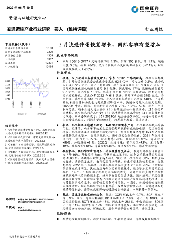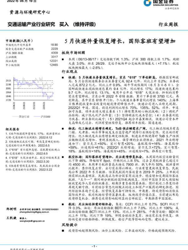 【国金证券】【20220619】5月快递件量恢复增长,国际客班有望增加-15页