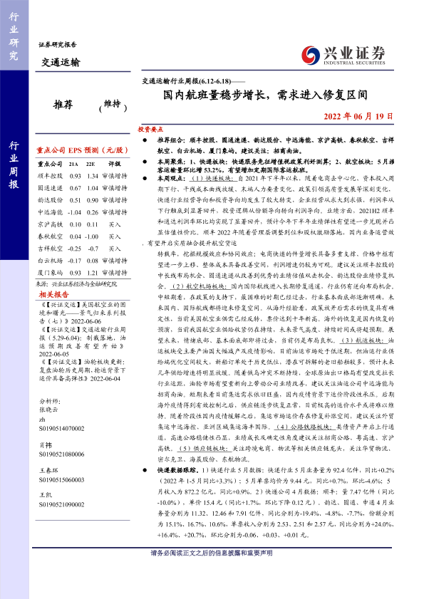 【兴业证券】【20220619】交通运输行业周报:国内航班量稳步增长,需求进入修复区间-35页