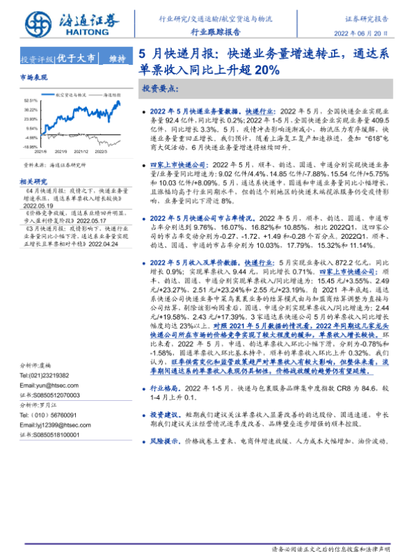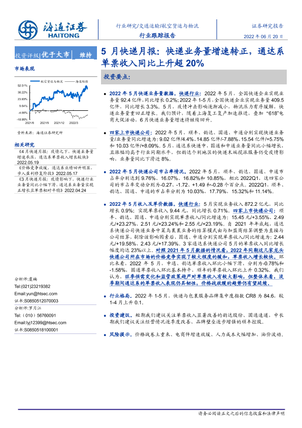 【海通证券】【20220620】5月快递月报:快递业务量增速转正,通达系单票收入同比上升超20%-9页